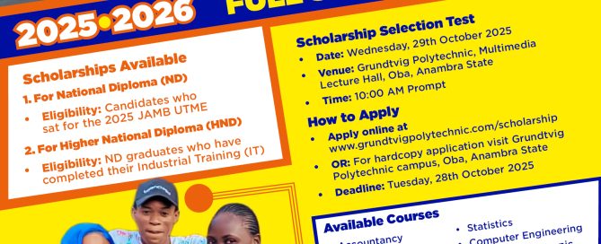 In line with our Corporate Social Responsibility, Grundtvig Polytechnic, Oba, Anambra State is offering FULL SCHOLARSHIPS to eligible candidates. WHO